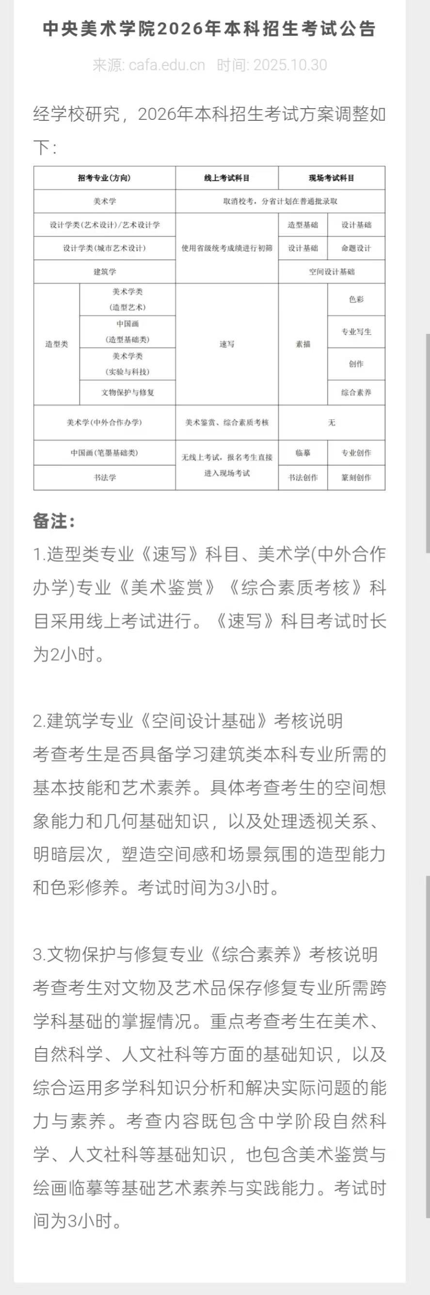 日前,中央美术学院发布《2026年本科招生考试公告》被艺考圈称为“地震”:美术学专业取消校考,艺术设计等专业使用省级统考成绩进行初筛。这是2024年艺考改革的持续深化,校考减少、文化成绩要求提高是大势所趋。艺考生需要一起进行高强度的专业课备考和文化课备考,艰辛程度其实更高于一般高考生,且经济投入不菲,因此学生和家长必须明确:艺考绝不是高考的轻松“捷径”。